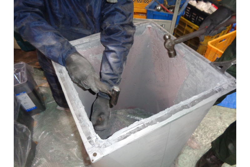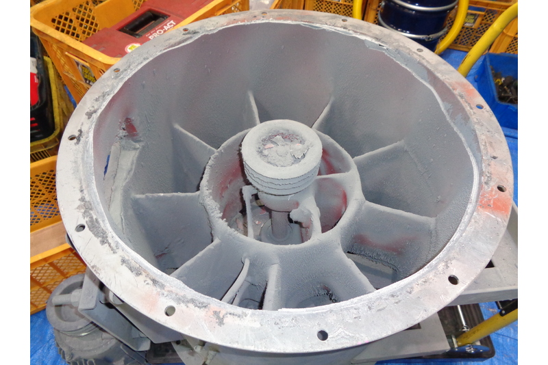 では今日のご報告です。本日は本社Aラインのファン交換工事です。塗装時に商品につかない塗料が水洗ブースに流れるのですがその塗料をファンで吸い上げダクトを通り外部へ出されるのですが当然ファンには塗料が付きます。その塗料が乾燥して固まっていくのですが定期的に交換しないとファンが動かなくなってしまいます(>_<)そうなる前に交換をする必要があるんです。
